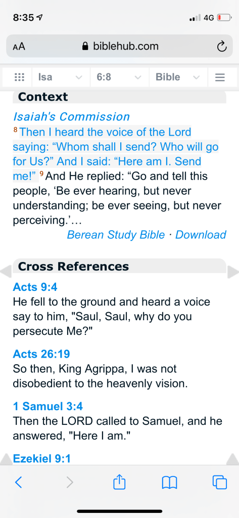 #3 – Isaiah responded. With not alot of details about the call, Isaiah responded – Here I am. That’s faith. The compelling nature of the call of God to respond to minimal detail but having a full assurance of the sufficiency and provision of God, in His time. Send me! I trust you to take care of what I leave behind. Being sent somewhere requires active physical presence and work in the desired location. It requires a physical response.